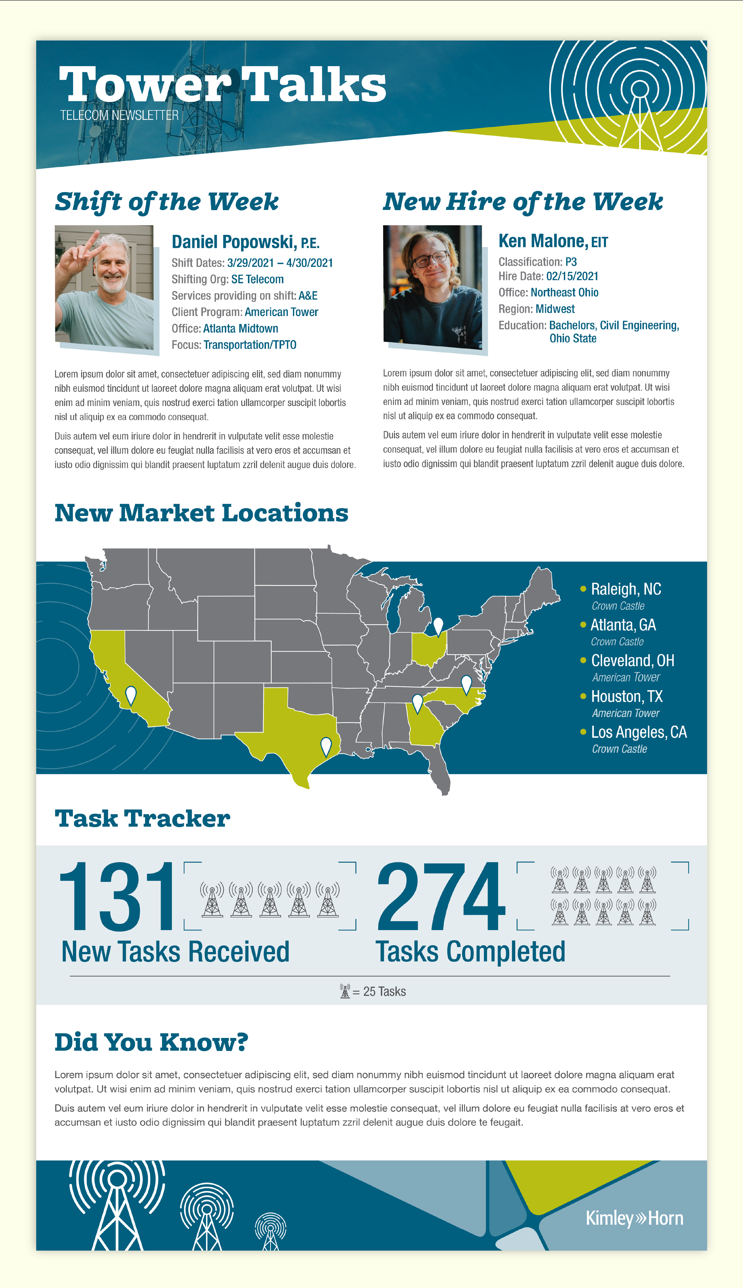 Successful expansion requires strong communication, transparency and excitement. So when Kimley-Horn’s telecommunications practice saw rapid growth, I helped the team brace for impact and support ongoing opportunities.